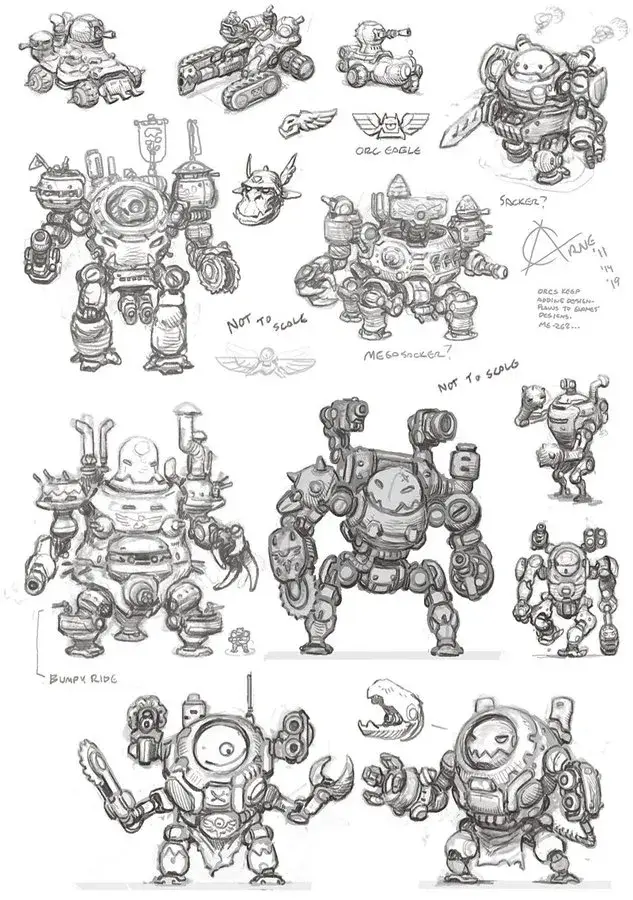 The concept art stages are quite fluid and vary from person to person, studio to studio. However, they typically start out with various Thumbnails and then move forward with a few into Initial Line Drawings. The level of detail increases with each stage as you move forward until you arrive at the Final Concept Art.