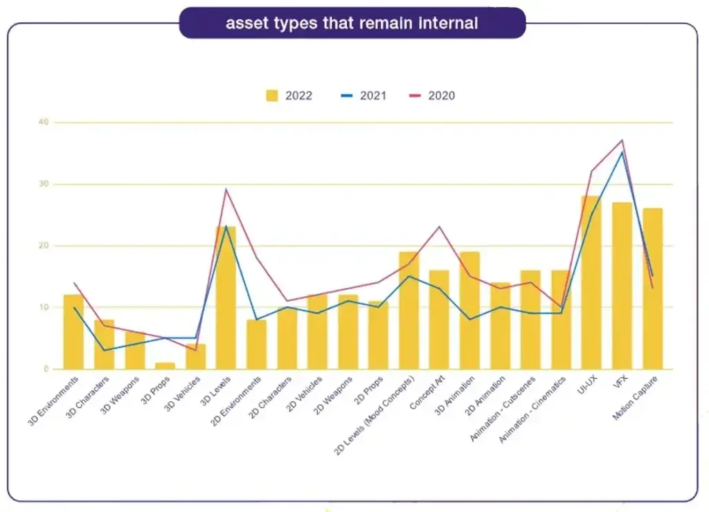 The latter has seen some turbulence in recent years – in 2020, concept art was at an all time high, with nearly 25% of all concept assets being completed in-house. In 2021, reflecting the work from home revolution, concept art production was dominantly outsourced; this year, however, concept art has seen a rise in internal production. This could be due to a lack of freelance concept artists, or because of a preference for permanent employees in concept art due to the rigorous iterative cycle of creating artwork.